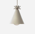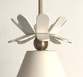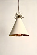 The Cleo Pendant's refined and elegant lines fit beautifully into modern dining rooms, living spaces, or entryways. Its subtle design and soft gold interior create a warm, inviting atmosphere suited to sophisticated interiors. It features a metal floral accent topped with a brass sphere that enhances its gentle white cone. The interior of the shade is finished in a subtle soft gold.