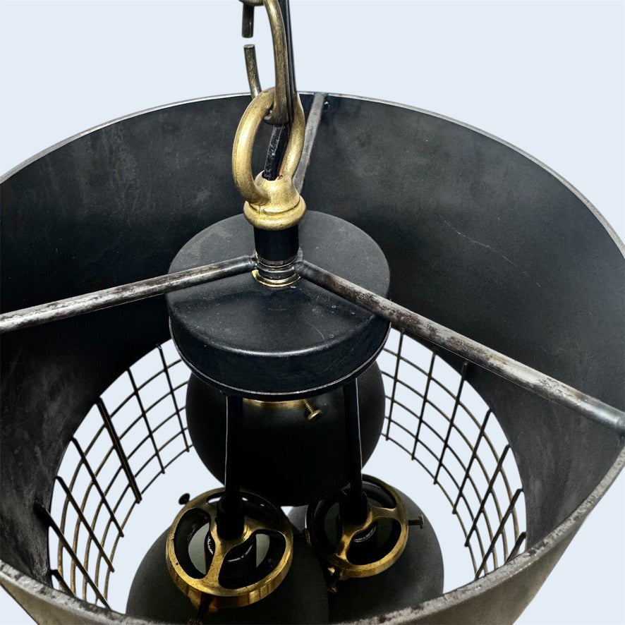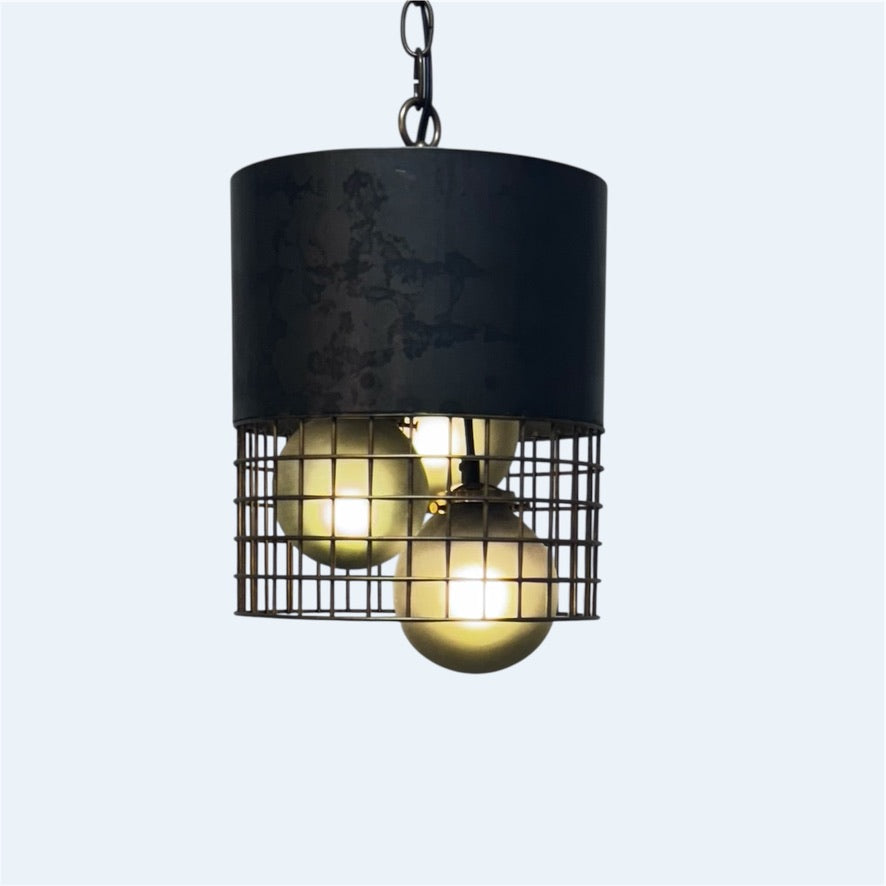 The Calder pendant showcases a striking architectural design, featuring three hand-blown glass globes in frosted black, housed within a blackened steel ring. A square open grid apron with a gold patina finish adds refined contrast, making this piece a sophisticated focal point in any modern interior.