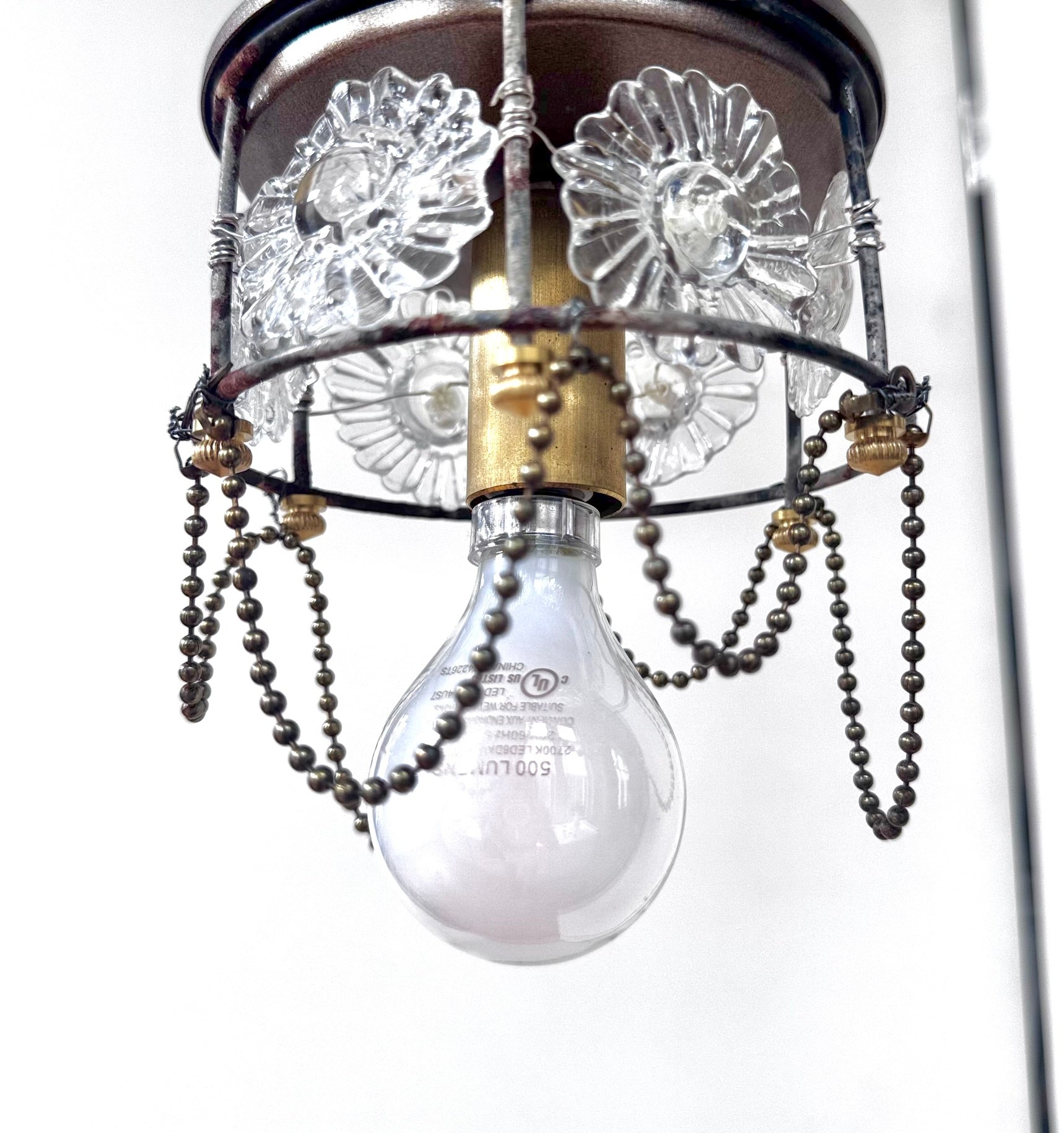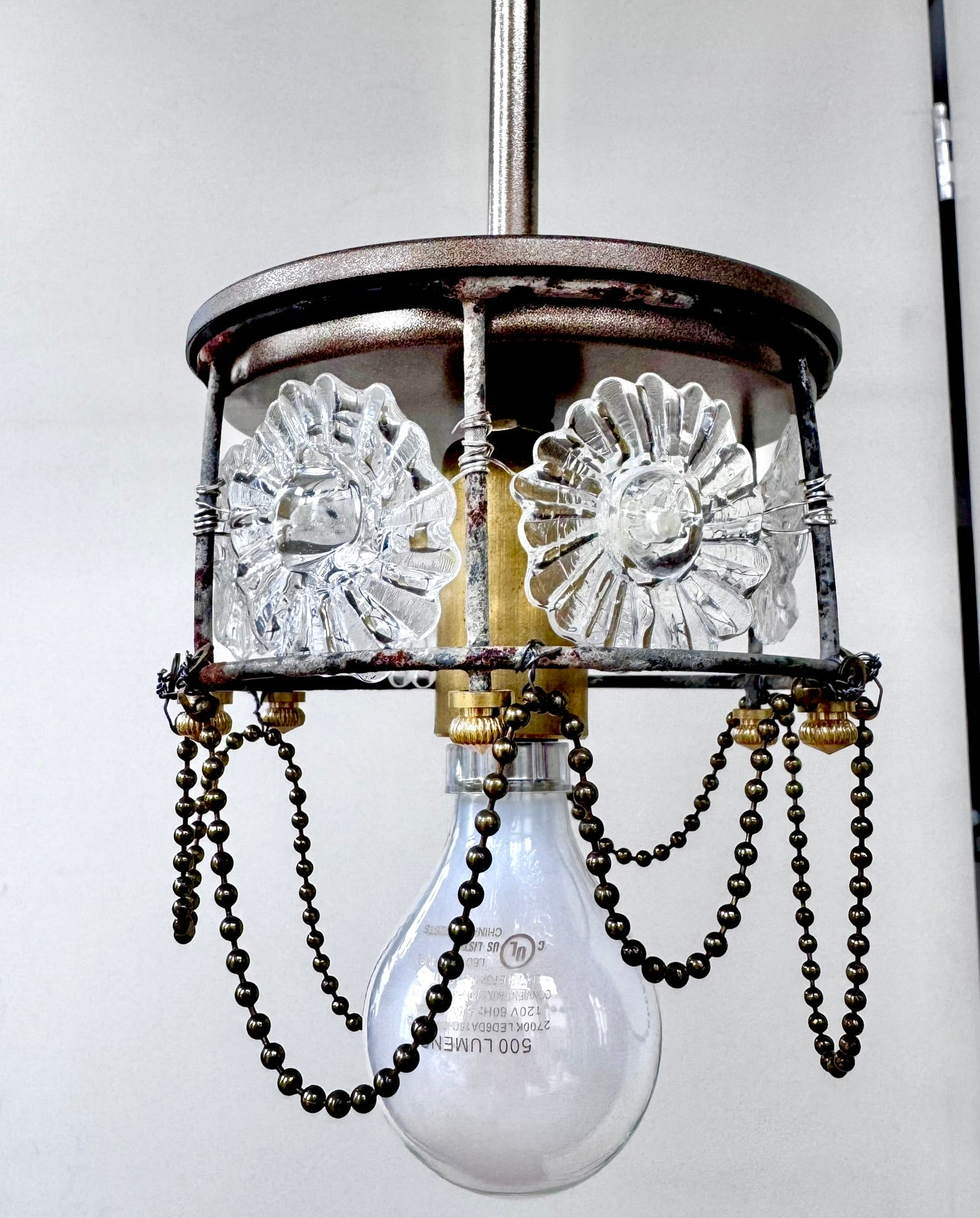 This brass beaded glass flower pendant blends timeless elegance with refined craftsmanship. Its delicate design is created with hand crafted glass flowers and brass beaded chain, offering a feeling of subtle sophistication and warmth.