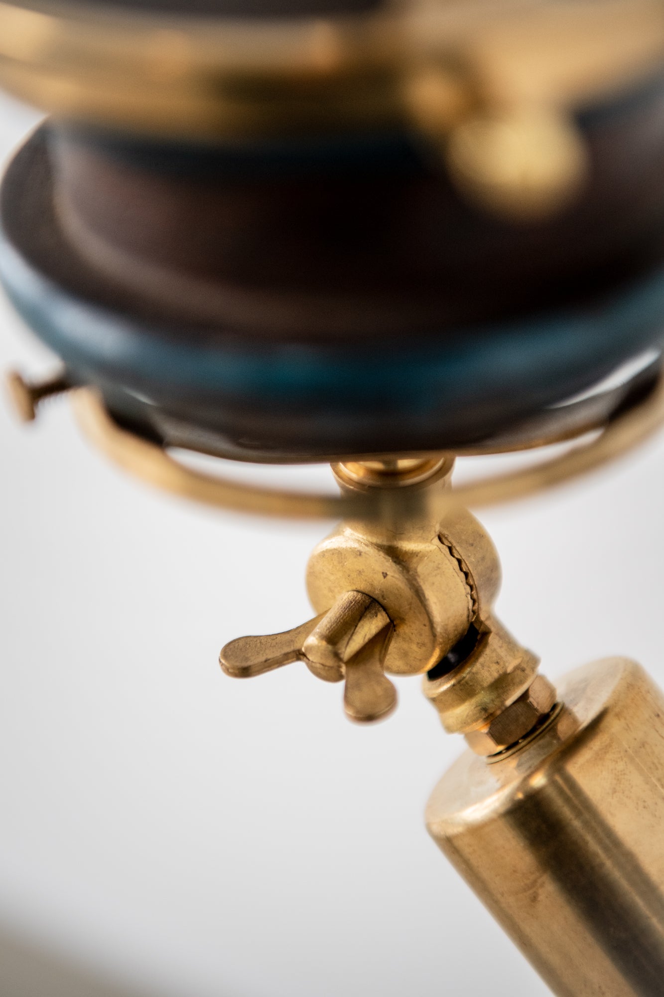 These vintage wooden spools were once used for holding textile thread for manufacturing purposes. We paired these wooden forms with bright brass accents to create a light fixture with directional intention. Use them as a single pendant or group them in multiples. We can provide a custom canopy for a grouping of multiple pendants. Call or email for pricing.