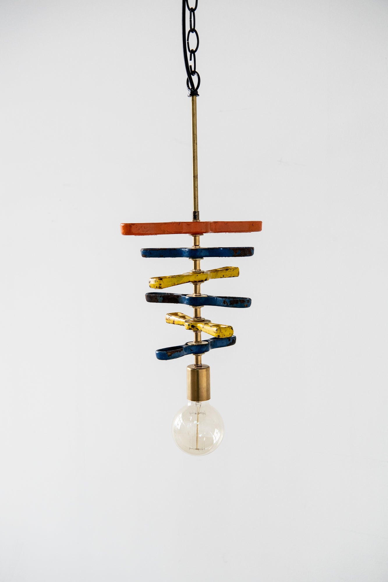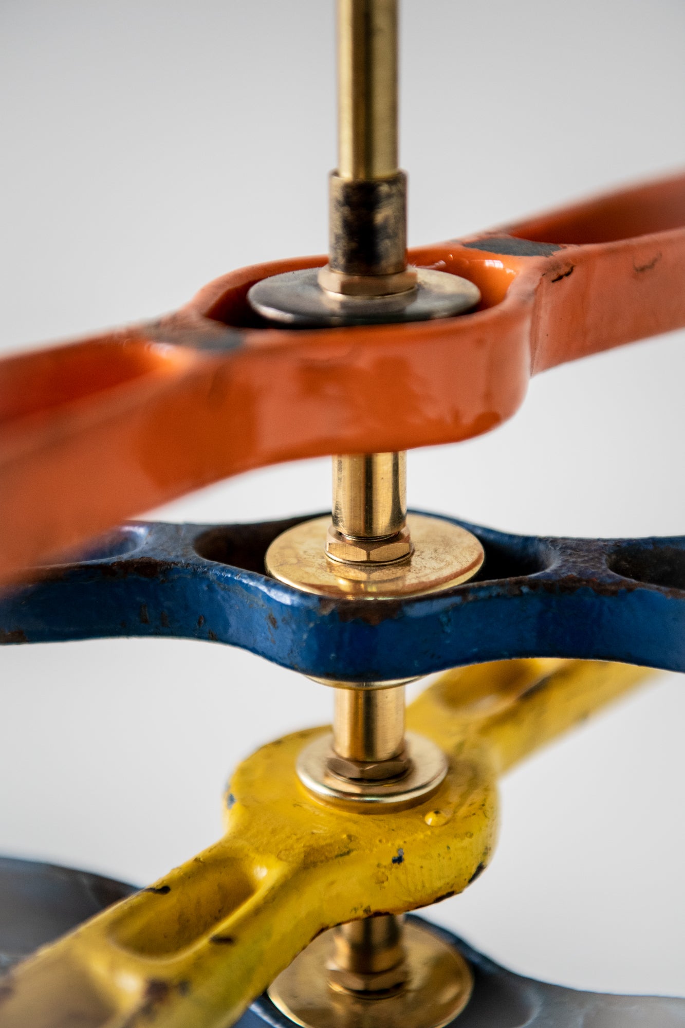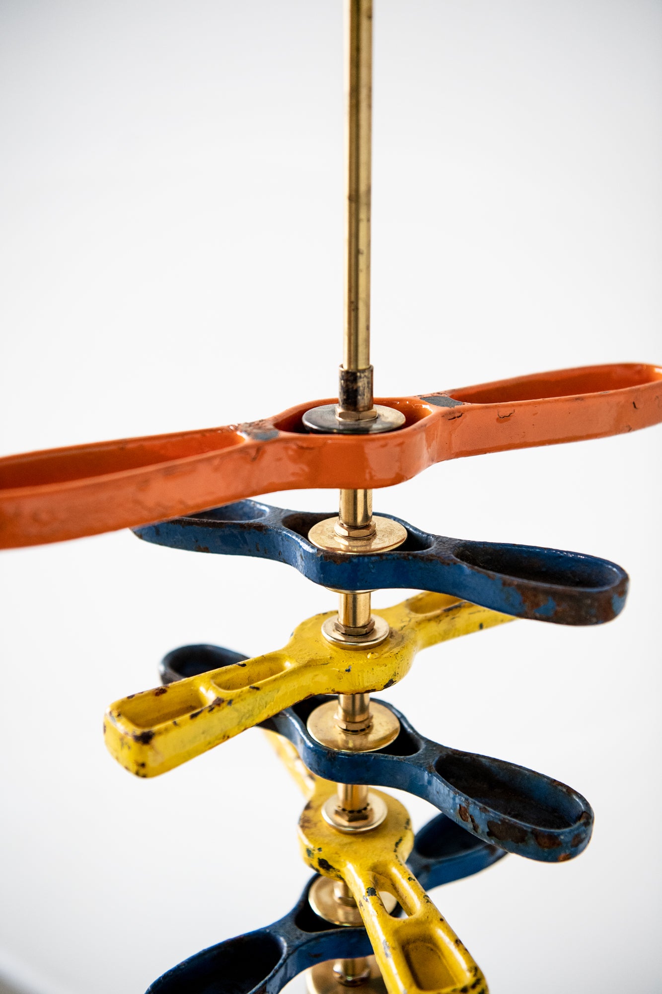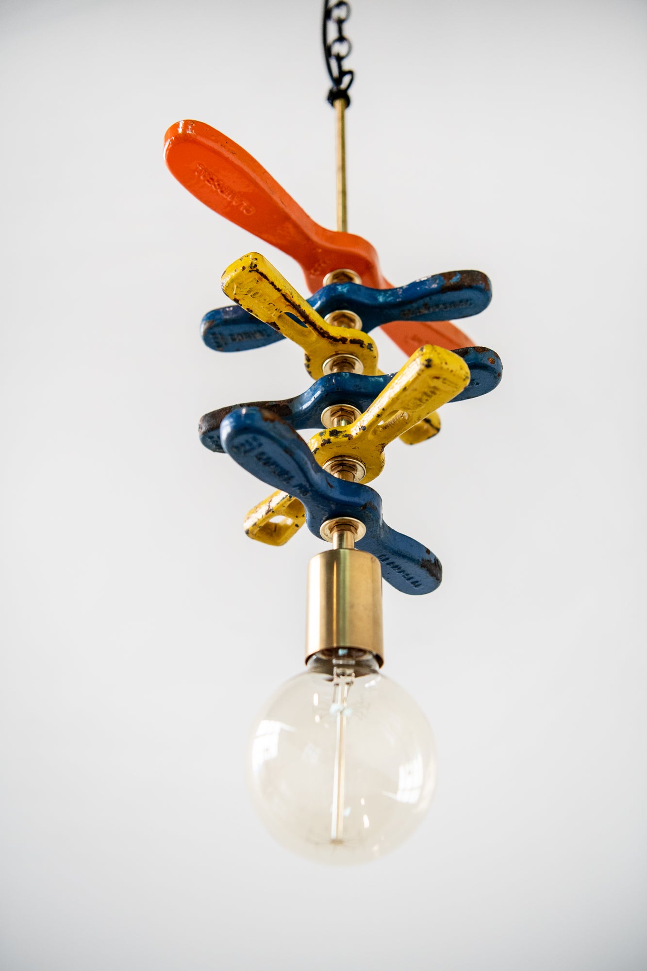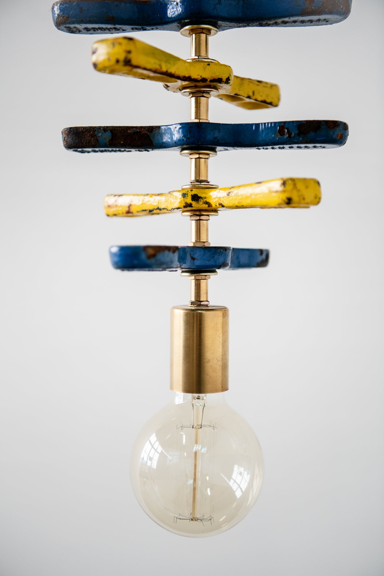 This colorful pendant, made from reclaimed valve handles and machine sprocket parts, reflects a commitment to eco-friendly design, turning repurposed materials into a playful light fixture. Each pendant is truly one of a kind, with varying sizes and sprocket shapes, ensuring no two are exactly alike.
