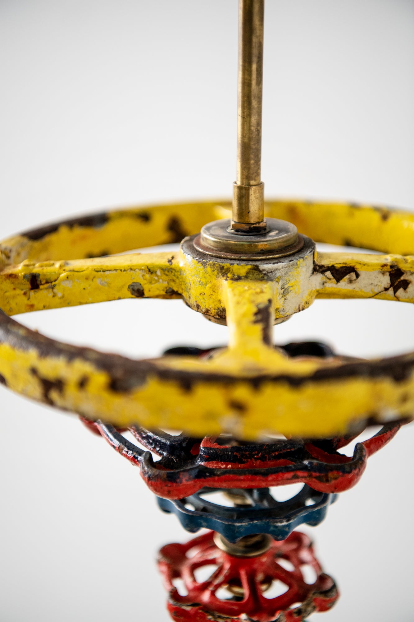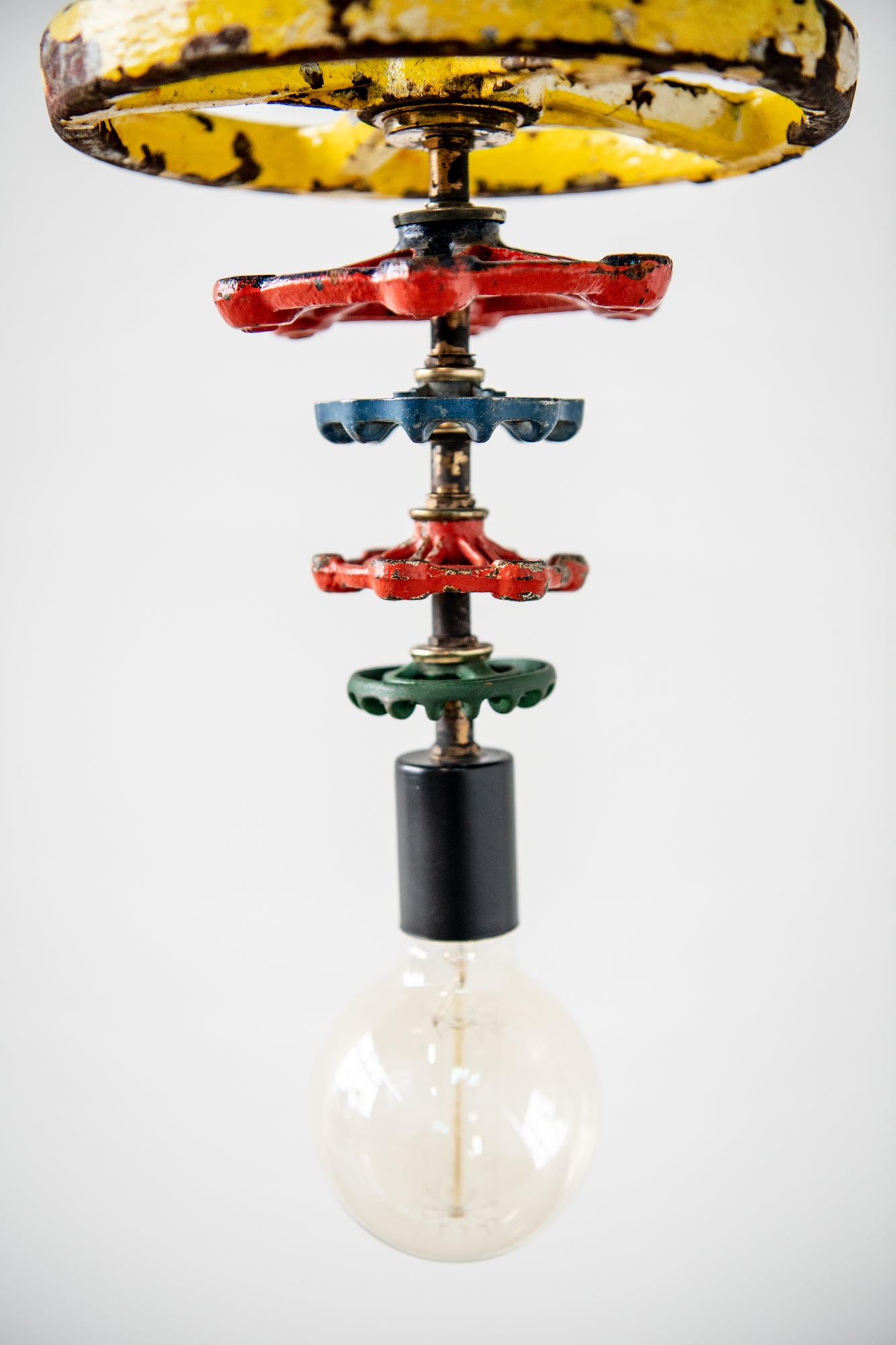 The Theo Pendant provides a unique and stylish take on a vintage industrial wheel lever design. Constructed from metal, each pendant is one of a kind and provides a splash of color to any room. These playful pieces differ in size and color, each piece is one of a kind. Sizes and colors will vary.