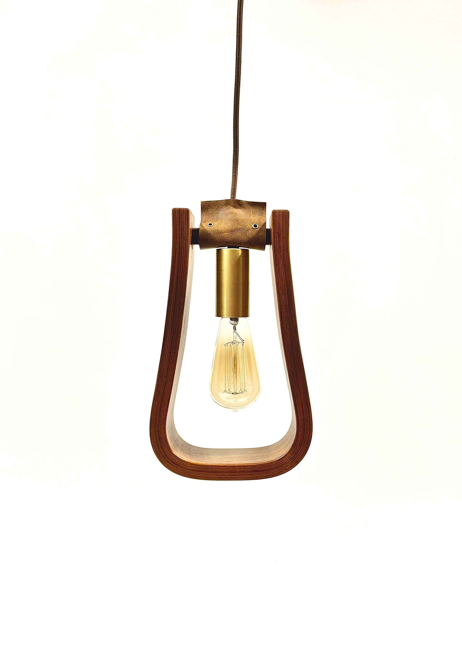 Inspired by classic Western design, this pendant reimagines the iconic stirrup as a sculptural light fixture. Crafted from rich walnut wood and detailed with brass accent hardware, elevated by a supple leather strap that adds both warmth and authenticity. Suspended from cloth-covered pendant cord, it brings a unique mix of rustic charm and refined craftsmanship to any space.